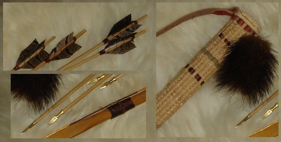 Cécile Posted December 30, 2008 Author Posted December 30, 2008 J'ai bien précisé que les matériaux n'avaient rien de l'époque médiévale, sauf le cuir, l'écorce de saule, le lin et le laiton... :bhaoui..: Tenez, un dernier nouveau pour Nanou : Rotin 100 %, carquois en cuir agrémenté de menus morceaux de vison, flèche en bois (remarquez les inserts en corne pour renforcer les encoches ;) ) avec des pointes en os. Plumes de perdreaux, je crois Comme il a une grosse pêche, les flèches sont plus grosses qu'à mon habitude. Il envoie également très bien ! :) Quote